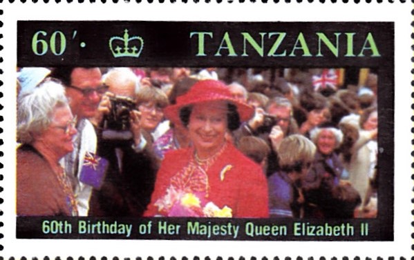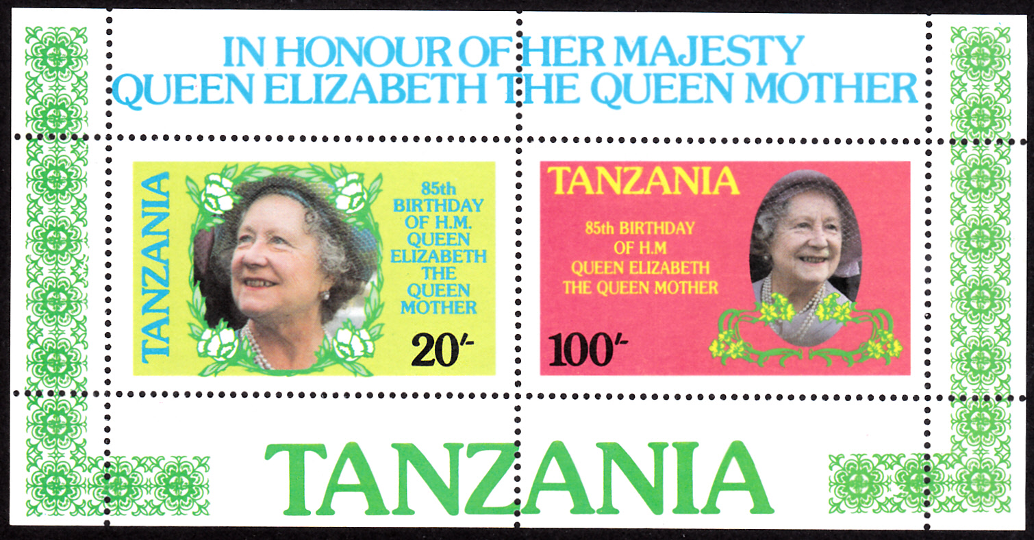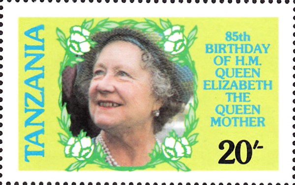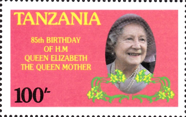 Zum 85. Geburtstag von Königinmutter Elisabeth erschien in Tansania in einer Serie diese Marke (MiNr 264) mit einem Porträt der Mutter von Elisabeth II.
