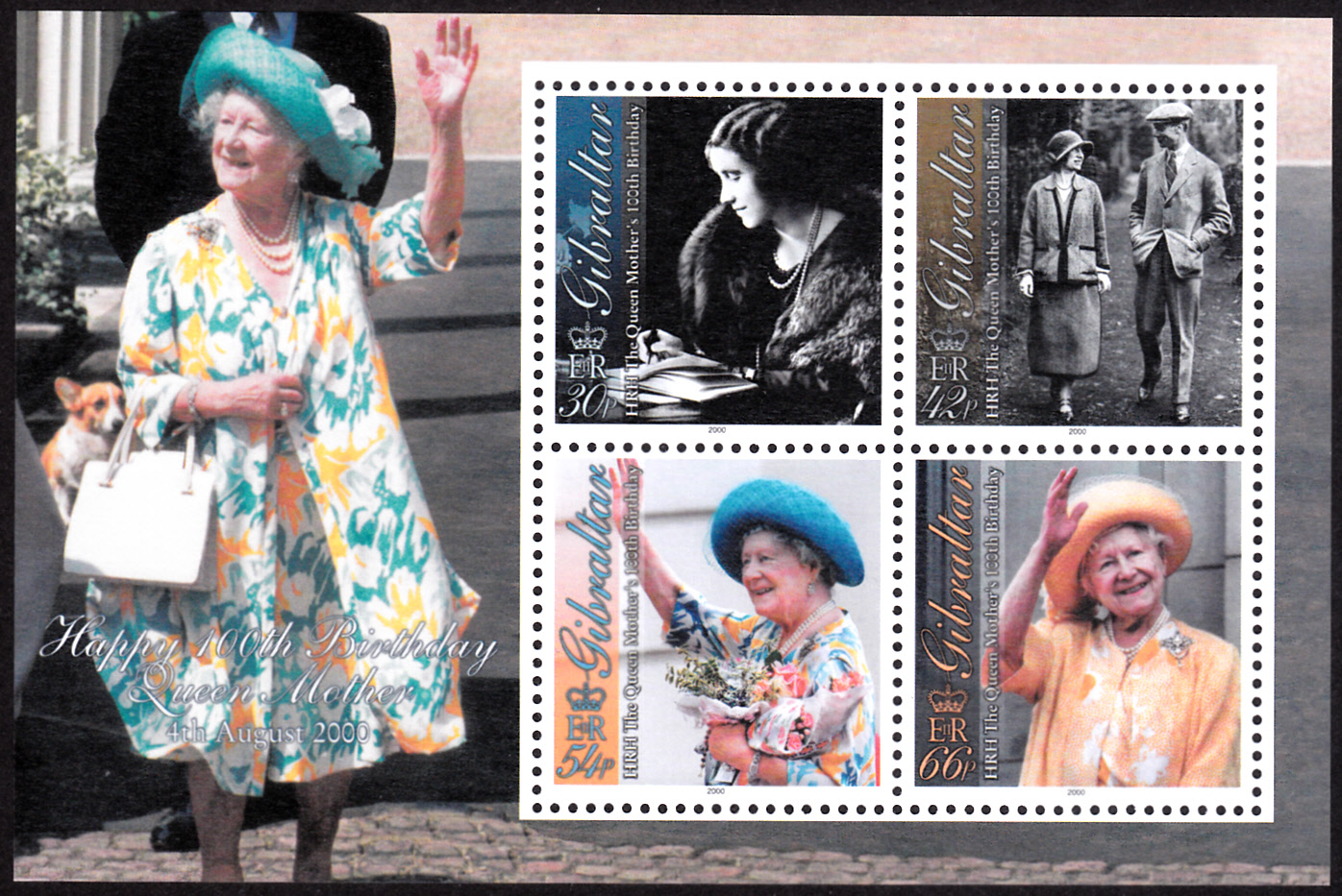 Zum 100. Geburtstag von Königinmutter Elisabeth erschien in Gibraltar in einer Serie eine Marke (MiNr 934) mit einer Abbildung der Mutter von Elisabeth II als junge Frau.