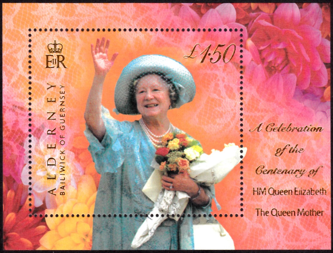 In Großbritannien-Guernsey erschien für Guernsey Alderney eine Blockausgabe (MiNr Block 8 mit Marke MiNr 157) zum 100. Geburtstag von Königinmutter Elisabeth.