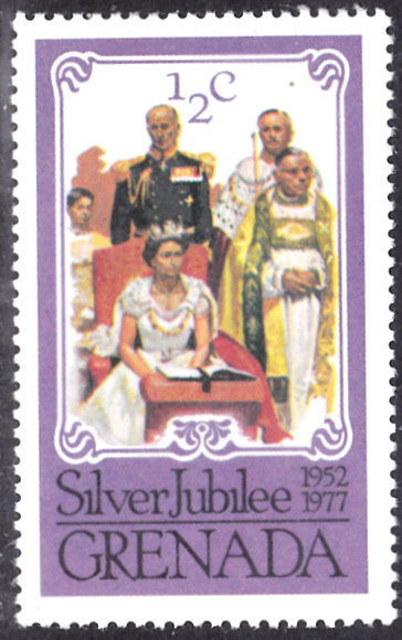 Auf dieser Marke aus Grenada (MiNr 822) zum Jubiläum "25 Jahre Regentschaft von Königin Elisabeth II." sehen wir die Krönungszeremonie.