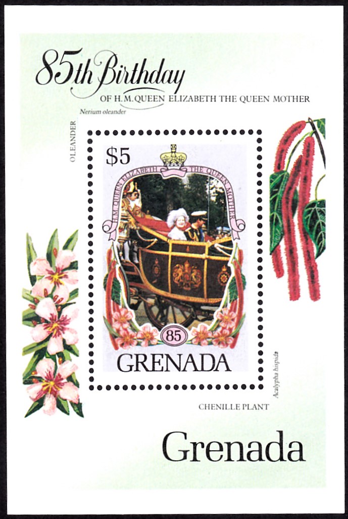 Es folgt ein Block aus Grenada (MiNr Block 142 mit Marke MiNr 1394) zum 85. Geburtstag von Königinmutter Elisabeth. Auf der Marke sehen wir die Königinmutter in einer Prunkkutsche.