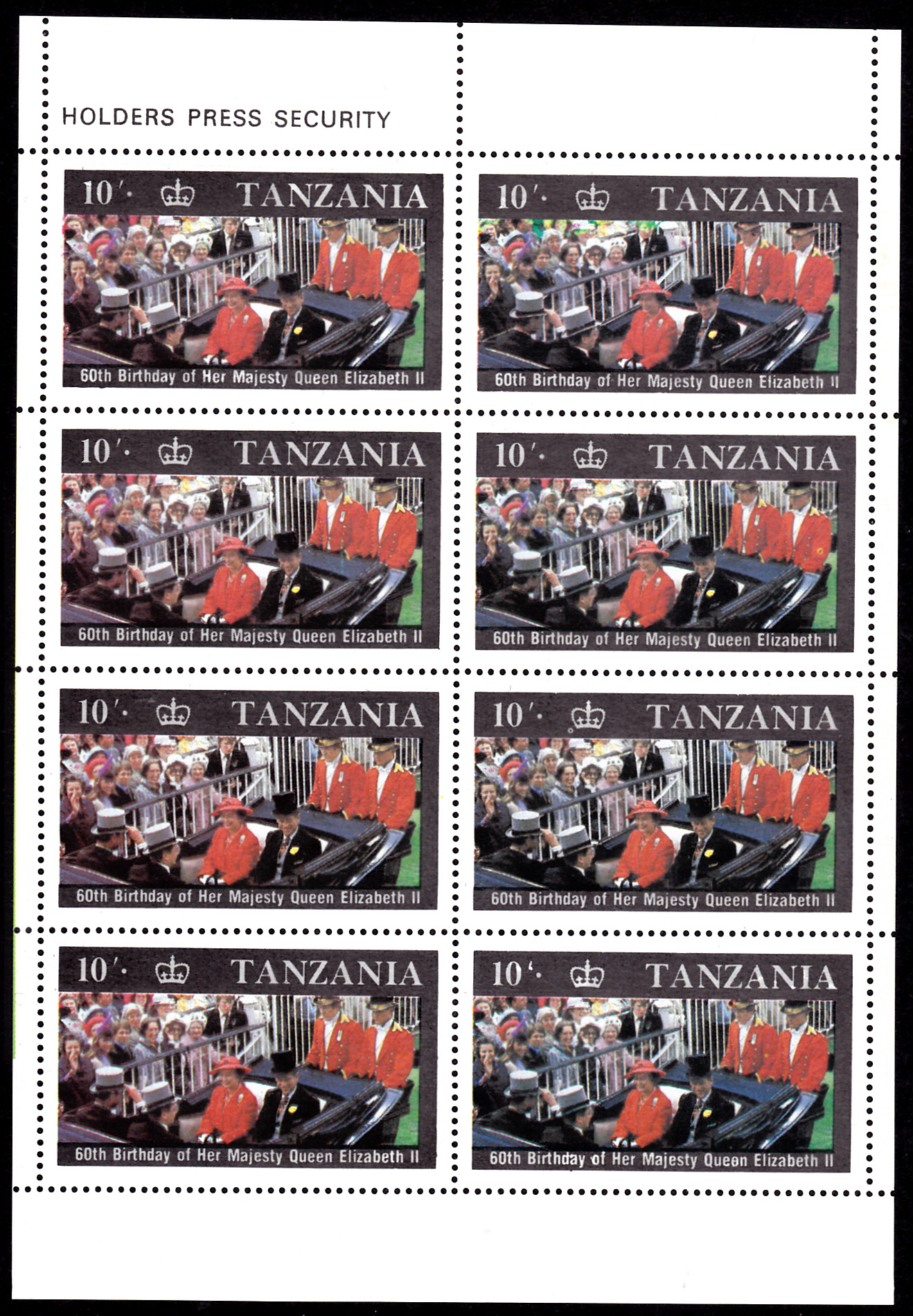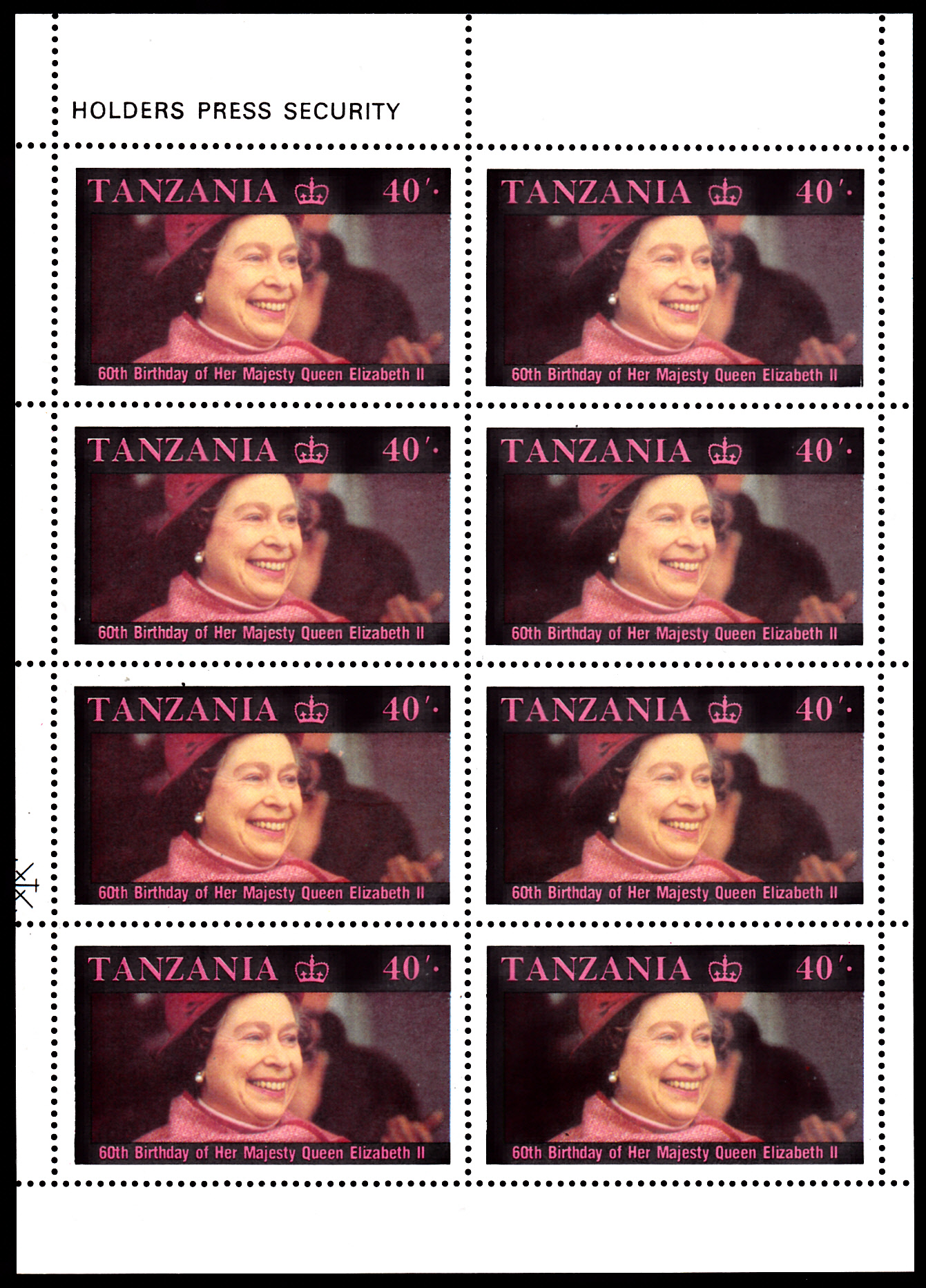 Ergänzend zur Serie zum 60. Geburtstag von Königin Elisabeth II. aus Tansania (MiNr 391 bis 394), die in Bögen zu je acht Marken erschienen ist, zeige ich hier einen kompletten Bogen zu acht Marken der MiNr 391.