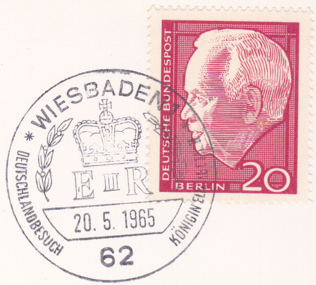 Sonderstempel aus Wiesbaden vom 20.5.1965 zum Besuch von Elisabeth II..