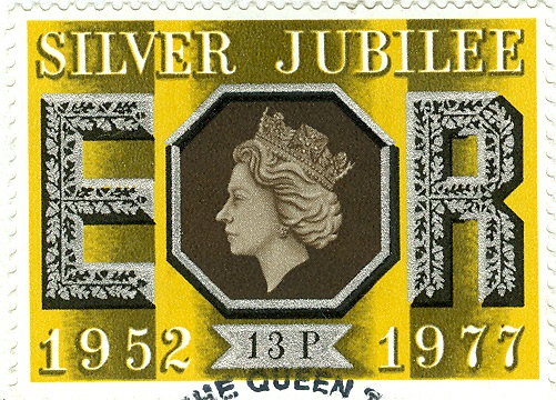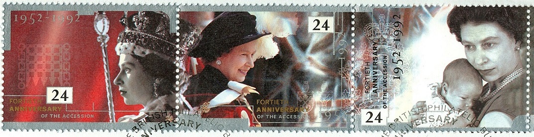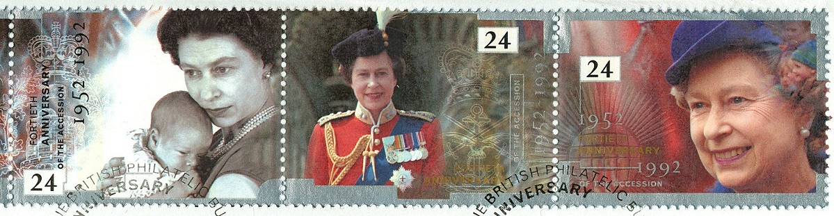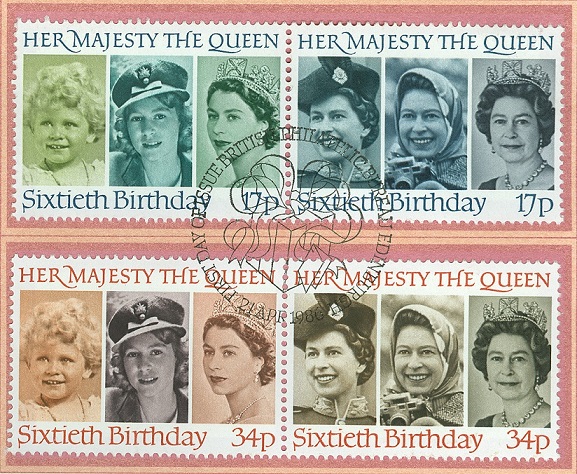 1986, zum 60. Geburtstag der Monarchin, gab die britische Post zwei Zusammendrucke in verschiedenen Farben heraus, auf dem auch jüngere Fotos der Jubilarin gezeigt wurden.