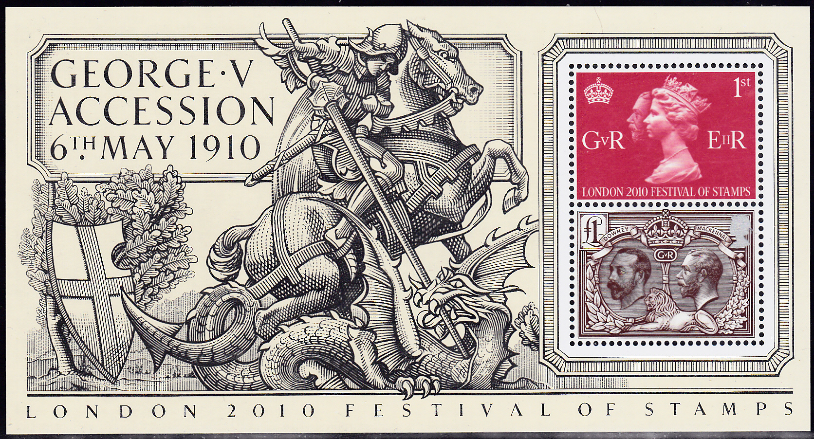 Zur Internationale Briefmarkenausstellung LONDON 2010 FESTIVAL OF STAMPS in London und zum 100. Jahrestag der Thronbesteigung von König George V. ist in Großbritannien diese Marke (MiNr 2938) mit den Kopfbilder von König George V. (1865-1936, reg. ab 1910) und Königin Elizabeth II. (1926-2022, reg. ab. 1952).