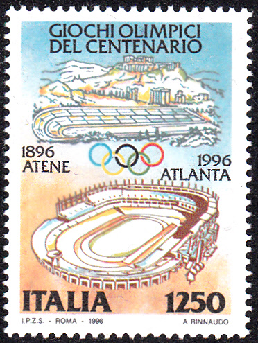 Auf dieser Marke aus Italien (MiNr 2448) aus einer Serie zu den Olympischen Spiele 1996 in Atlanta sind im oberen Teil der Marke das Olympiastadion von 1896 und die Akropolis in Athen abgebildet.