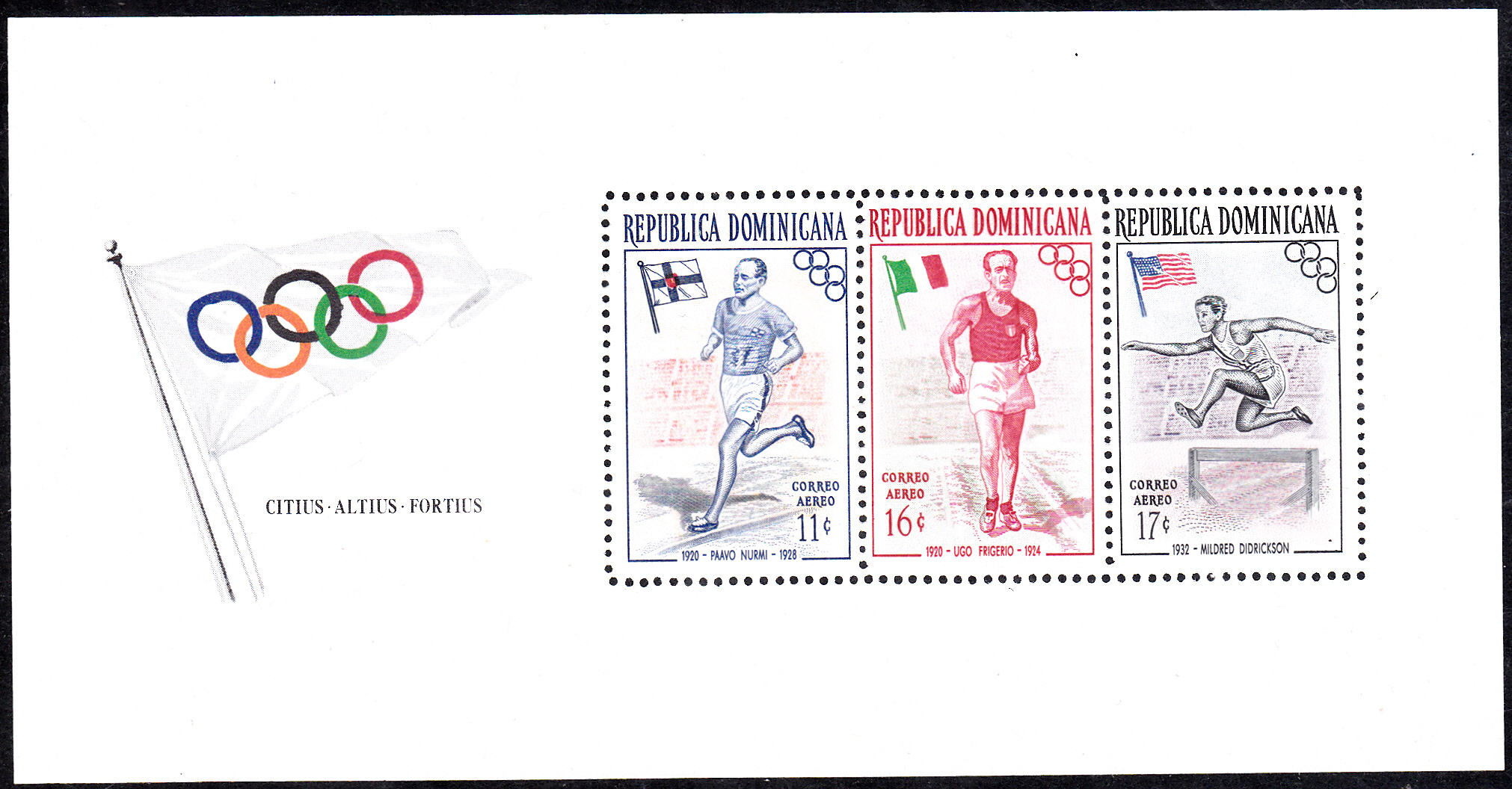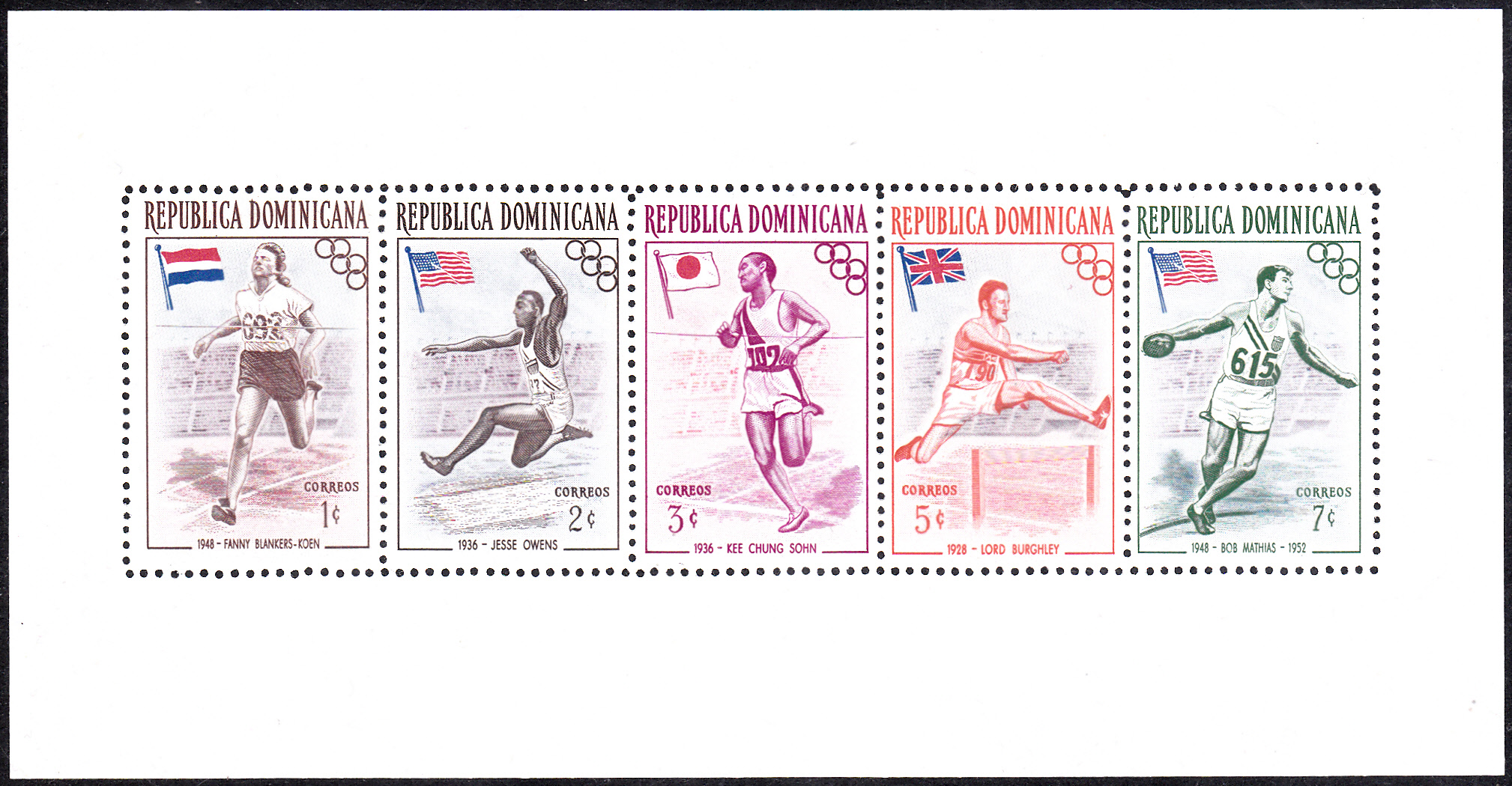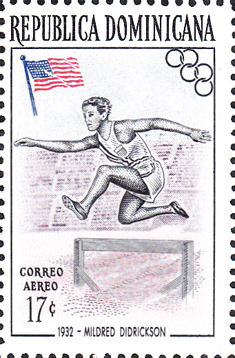 Die letzte Marke dieser Ausgabe (MiNr 567 A) bildet die zweifache Olympiasiegerin von 1932, Mildred Didrikson (1911-1956, USA) beim Hürdenlauf ab.