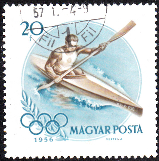 Auch in Ungarn gab es zu den Olympischen Sommerspielen 1956 in Melbourne eine Markenserie. Hier die Marke zu 20 Filler (MiNr 1472) mit der Abbildung eines Kanuten beim Einer-Kajak.