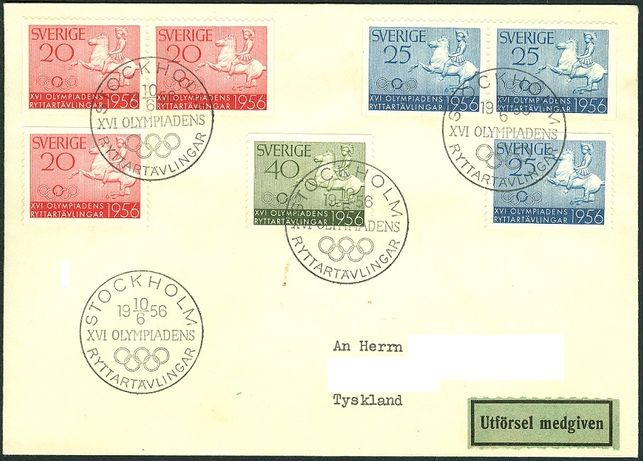 Die wegen der Quarantänebedingungen Australiens vergebenen "Reiterspiele", die olympischen Reitdisziplinen, fanden vom 10. - 17. Juni 1956 im schwedischen Stockholm statt.