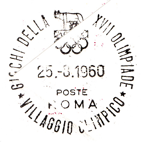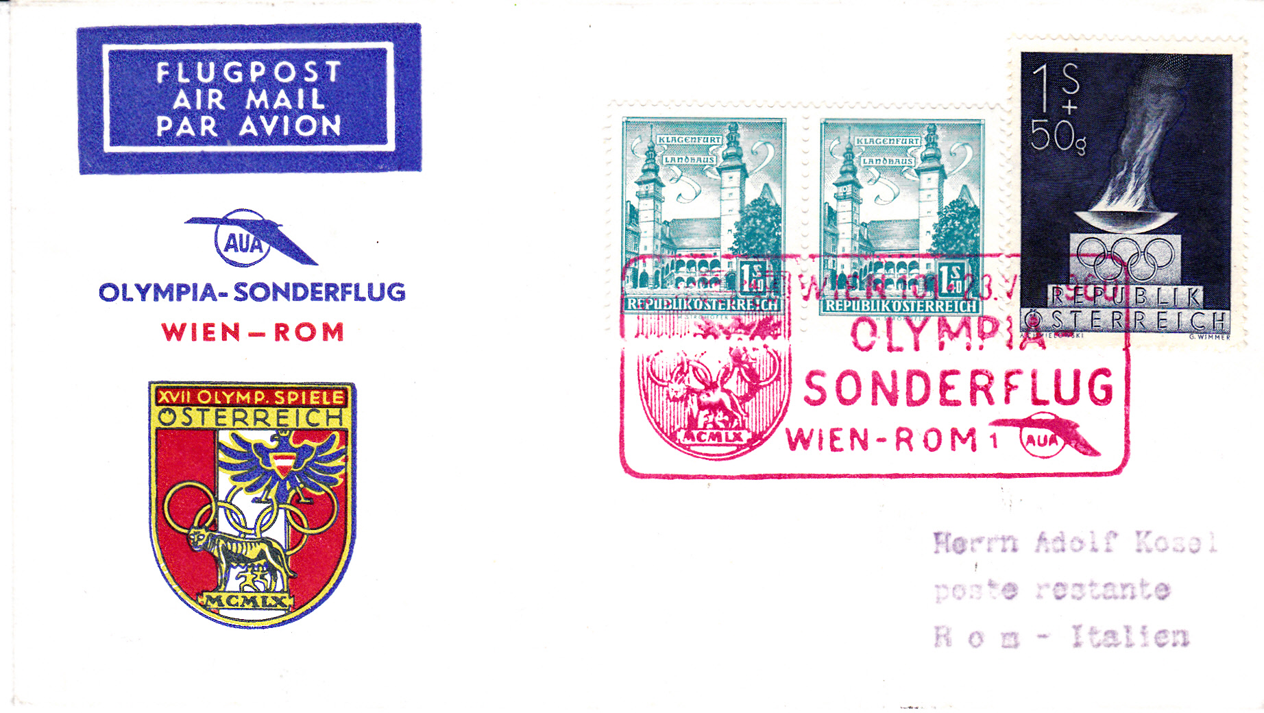 Zum Olympia-Sonderflug Wien - Rom gab es dieses "Offizielle Kuvert" mit eingedrucktem Luftpostvermerk. Dieser Beleg wurde am 23.8.1960 mit einem roten Postsonderstempel entwertet und mit dem Sonderflug befördert. Rückseitig ist ein Ankunftsstempel zu finden.
