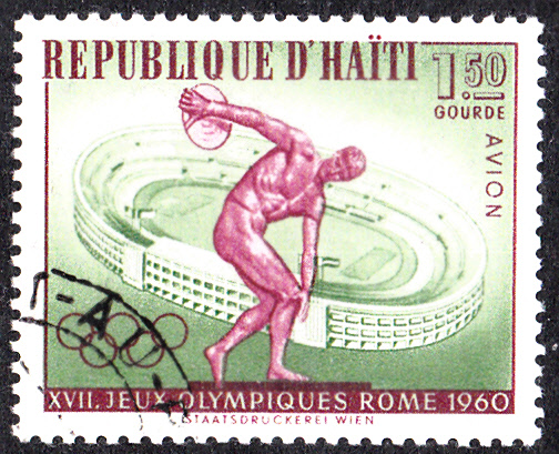 Ein zweite Luftpostmarke zu 1,50 Gourde (MiNr 634) hat das gleiche Motiv wie die Marke zu 20 Centimes: den "Discobolus" des antiken Bildhauers Myron (um 450 v.Chr.) und das Olympiastadion in Rom.