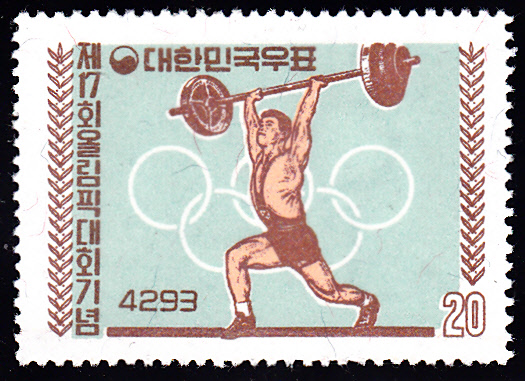 Diese Marke mit einem Gewichtheber (MiNr 307) wurde zu den Sommerspielen in Rom in Südkorea verausgabt.