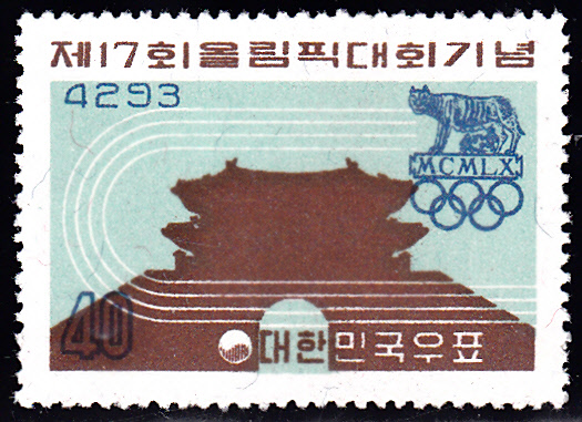 Auf einer zweiten Marke aus Korea-Süd (MiNr 308) werden das Südtor in Seoul und das Symbol der Olympiade Rom abgebildet.