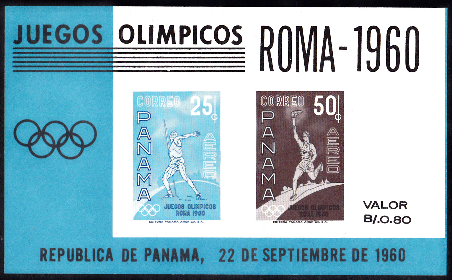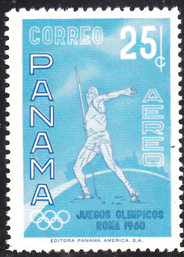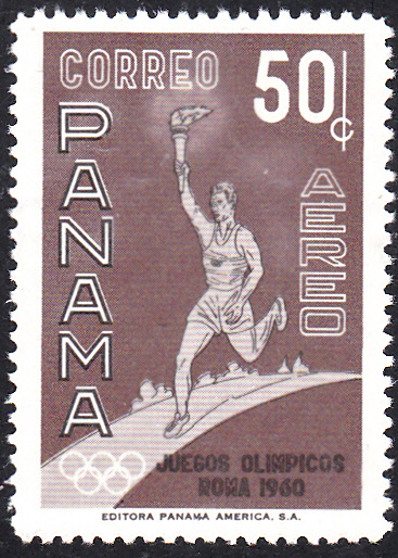Die Marke zu 50 Cent (MiNr 577 A) mit einem Fackelläufer beendet die Serie aus Panama.