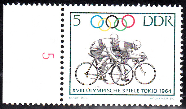 In der gleichen Serie der DDR zu den Olympischen Spielen erschien diese Marke (MiNr 1033) mit der Abbildung einer Spielszene beim Volleyball. Hier wieder eine Marke vom linken Bogenrand. Interessant ist, dass bei dieser Marke auf dem linken Bogenrand immer die Reihenwertzahl zu finden ist und auf dem rechten Bogenrand die Reihenzahl, also genau umgekehrt wie bei der Marke zu 5 Pfennig.