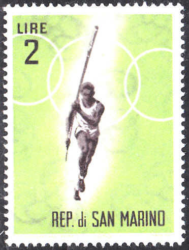 In San Marino ist 1963 bereits eine Markenserie zu den Olympischen Spielen 1964 in Tokio erschienen. Hier die Marke zu 1 Lira (MiNr 782) mit der Abbildung von zwei Hürdenläuferinnen.