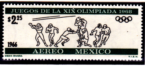 Diese Marke (MiNr 1217) aus der vorolympischen Serie 1966 aus Mexico zeigt eine Szene aus dem American Football, obwohl meines Wissens diese Sportart nie olympisch war.