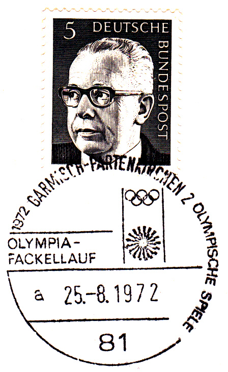 Und nun folgt der Sonderstempel Olympia-Fackellauf aus Garmisch-Partenkirchen vom 25.8.1972 mit Kennbuchstaben a ohne Uhrzeit: