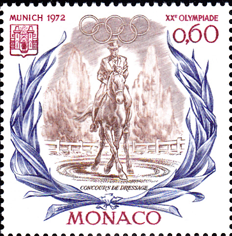 Aus Monaco waren fünf Teilnehmer/-innen bei den Wettbewerben in München vertreten. Die Marken Monacos zu den Spielen in München zeigen Motive zum Pferdesport. Hie eine Marke (MiNr 1045) mit einem Dressurreiter.