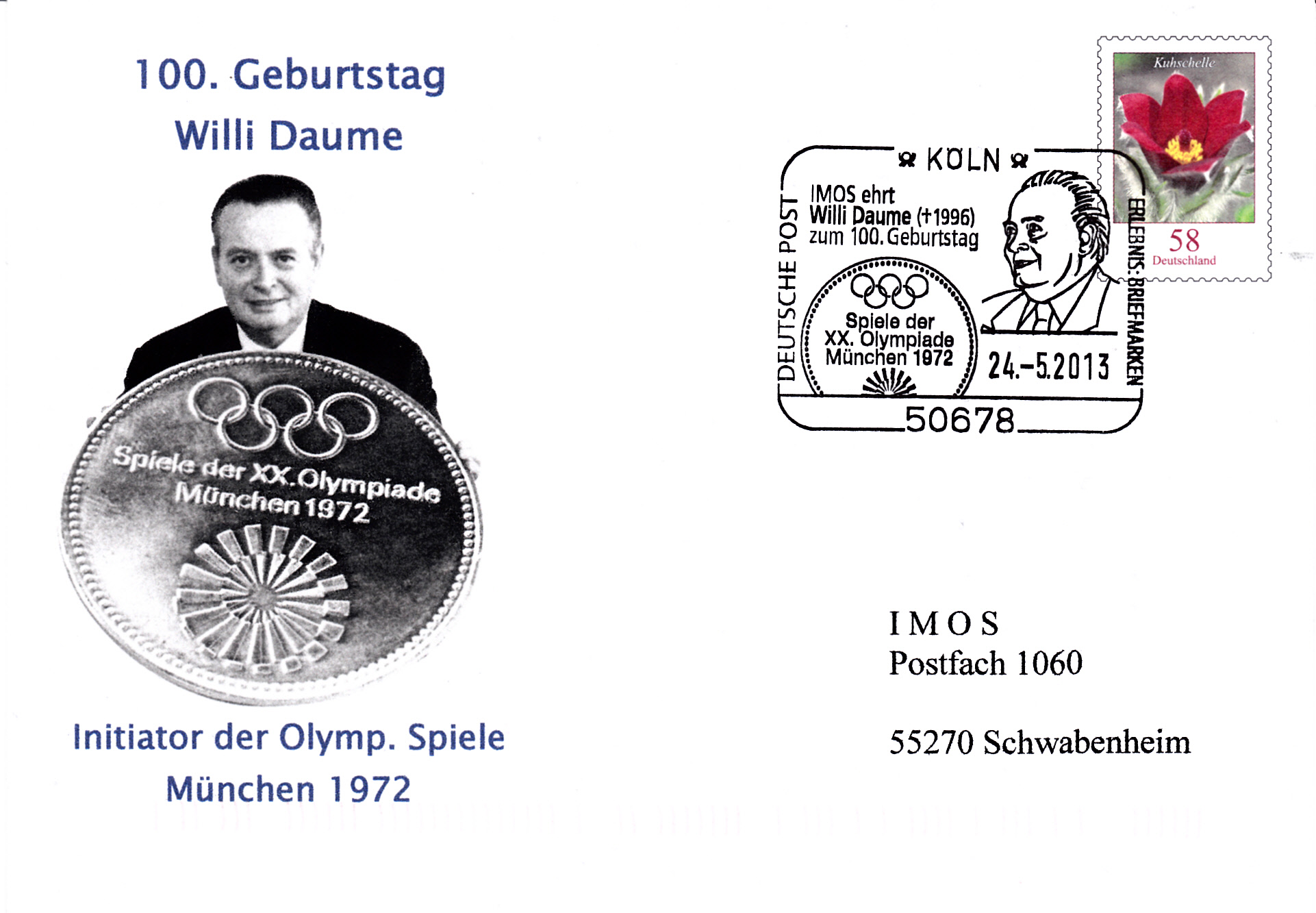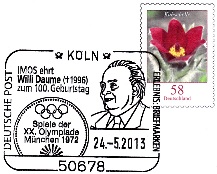 Plusbrief (MiNr U 42) mit dem Wertstempel "Kuhschelle" (MiNr 2968) und mit einem Zudruck zum 100. Geburtstag von Willi Daume und einem dazu passenden Sonderstempel vom 24.-5.2013 aus Köln. Der Zudruck und der Stempel zeigenb unter anderem auch jeweils ein Porträt von Daume.