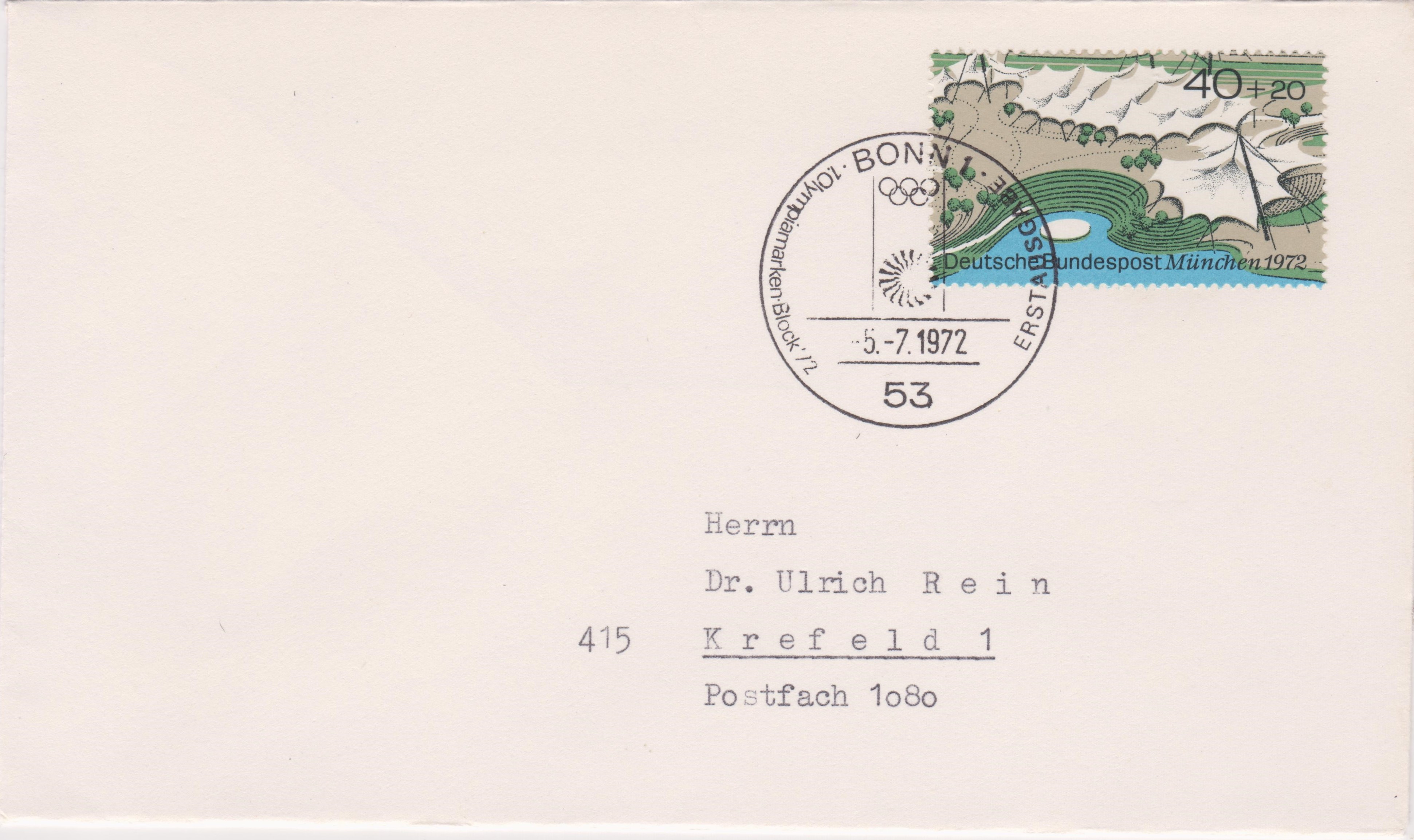 Bund MiNr. 724 zeigt das Olympiastadion der Olympischen Sommerspiele in München, hier als Einzelfrankatur am 05.07.1972 portogerecht auf Briefdrucksache bis 20 g, entwertet mit Ersttagsstempel: