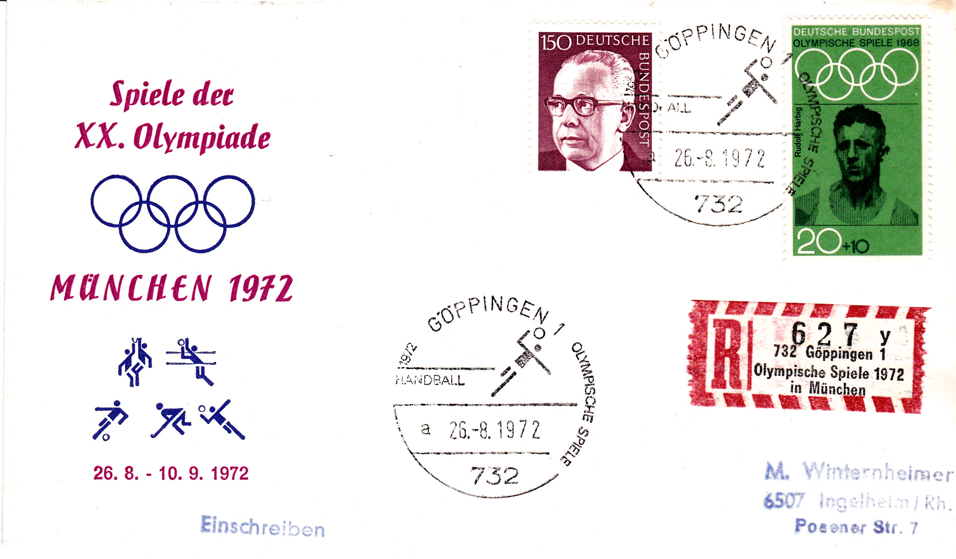 Brief per Einschreiben mit dem Sonder-R-Zettel "732 Göppingen 1, Olympische Spiele 1972 in München" und mit dem Sonderstempel "Handball" vom 26.8.1972 mit dem Kennbuchstaben "a" mit vollständigem Datum ohne Uhrzeit.