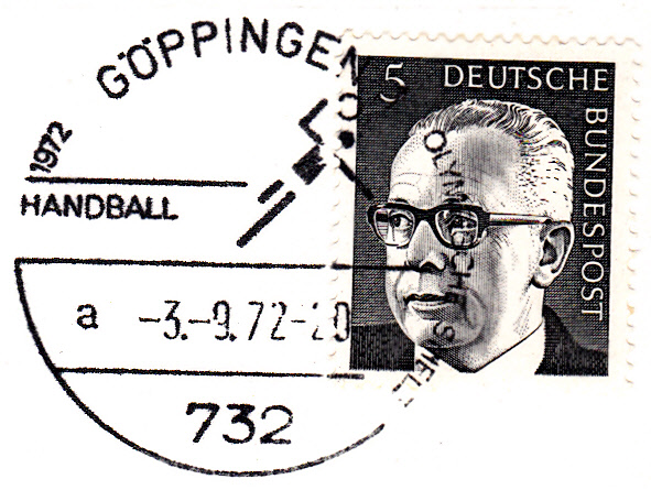 Sonderstempel "Handball" vom 3.9.1972 mit dem Kennbuchstaben "a" mit Uhrzeit.