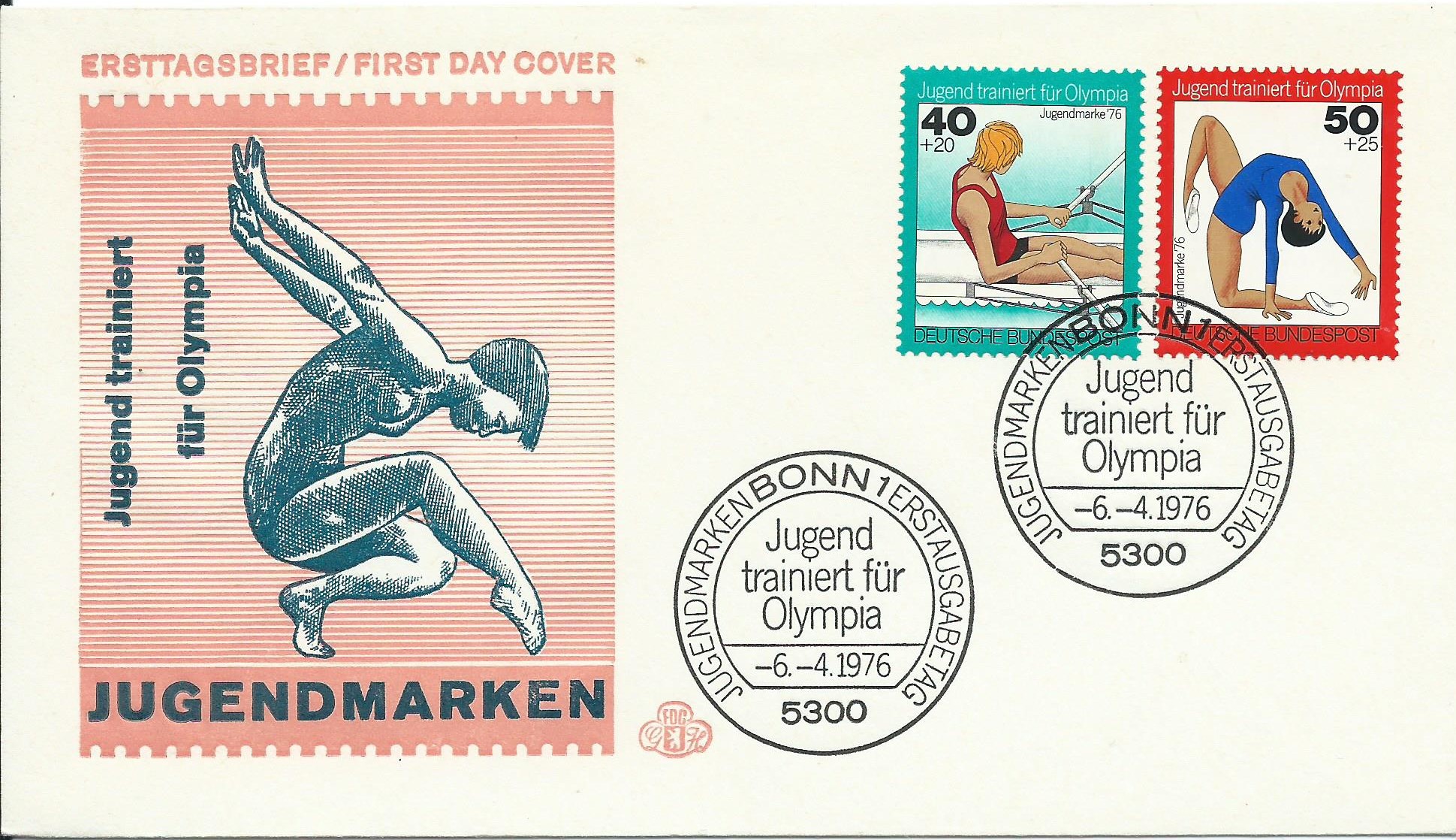 Als Ergänzung zu meinem Beitrag vom 15.8. noch einmal der Satz "Jugend trainiert für Olympia auf Ertsttagsbelegen mit passendem Ersttagssonderstempel vom 6.4.76 aus Bonn: