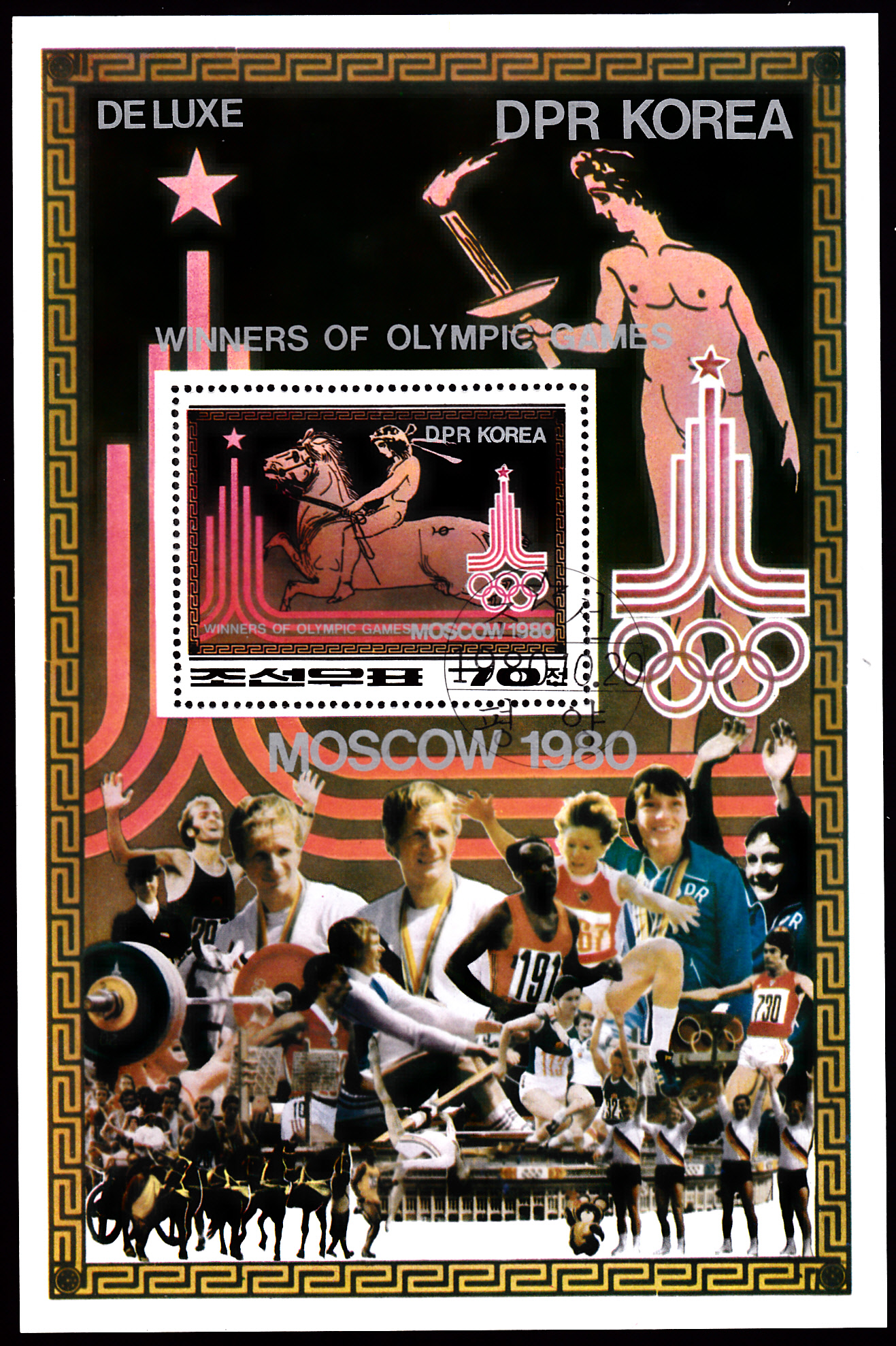 In Nord-Korea ist eine Serie mit Olympiasieger und Medaillengewinner bei den Sommerspielen 1980 erschienen. Ich kann aus dieser Ausgabe hier einen Block (MiNr Block A 84 mit einer Marke MiNr 2060) zeigen. Auf der Marke ist ein Antiker griechischer Reiter zu sehen, auf dem Block vermutlich einige Medaillengewinner. Wer Lust hat, kann sich die Personen mal ansehen und die Namen bestimmen.