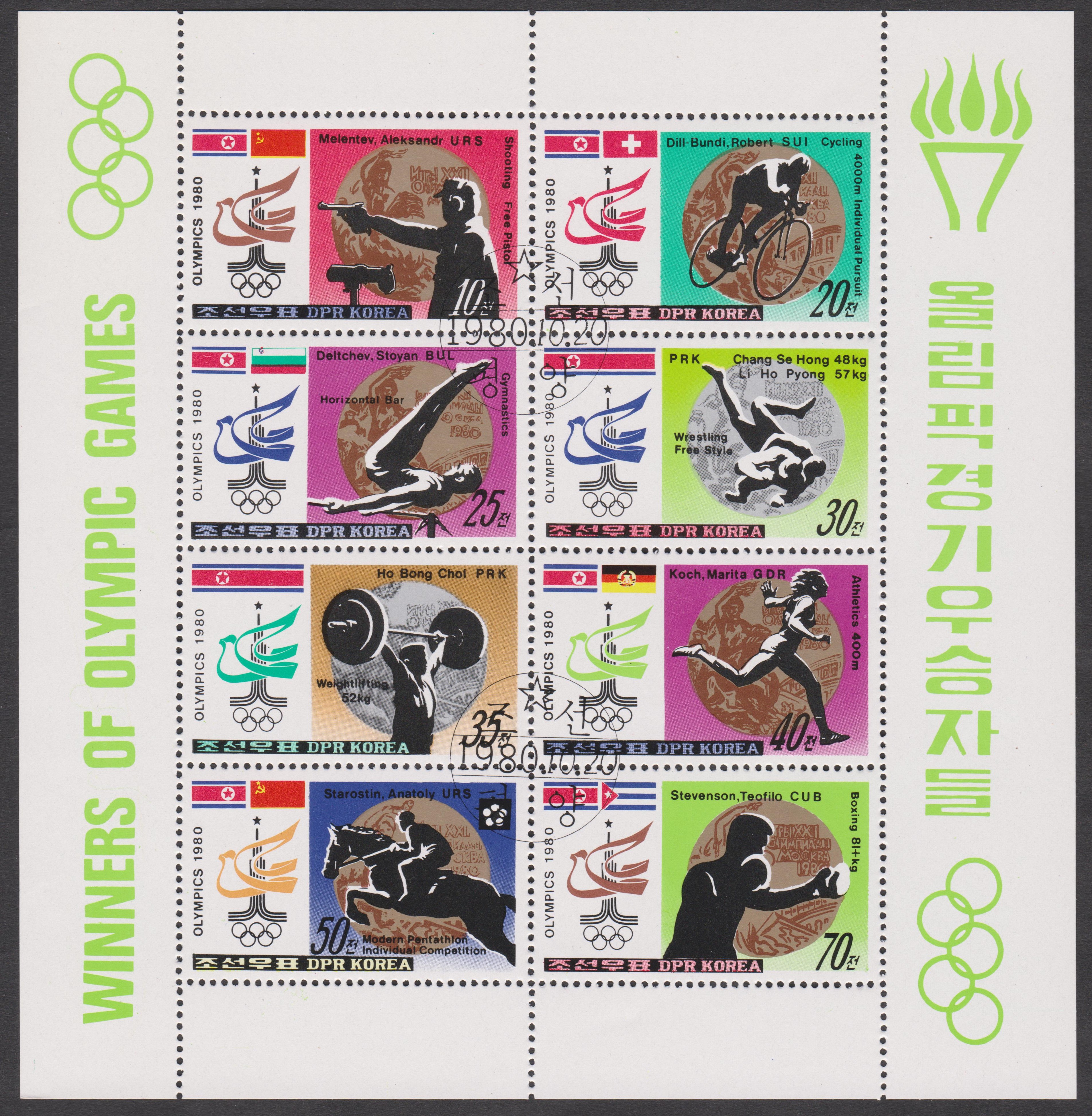 Nordkorea MiNr. 2052 - 2059 erschienen am 20.10.1980 und zeigen Medaillengewinner der Olympischen Spiele in Moskau 1980: