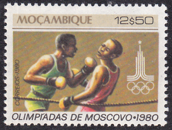 Aus der zweiten Serie aus Mocambique zu den Spielen in Moskau kann ich leider nur die Marke zu 12,50 Escudos (MiNr 770) mit der Abbildung einer Szene bei einem Boxkampf zeigen.