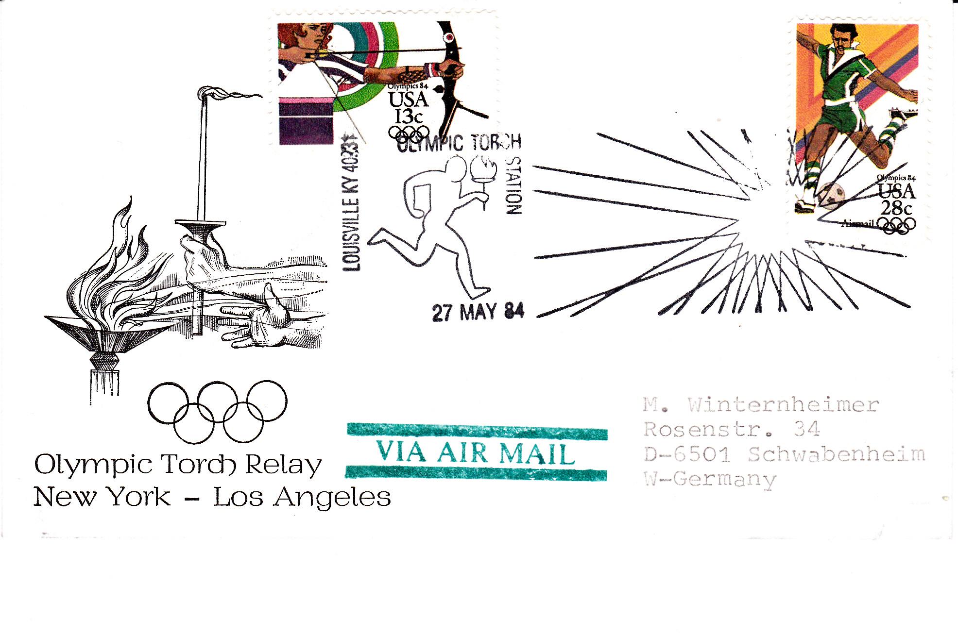Am 27.5.1984 durchquerten der Olympische Fackellauf Louisville, wie uns dieser Stempel auf dem Luftpostbrief nach Deutschland verrät.