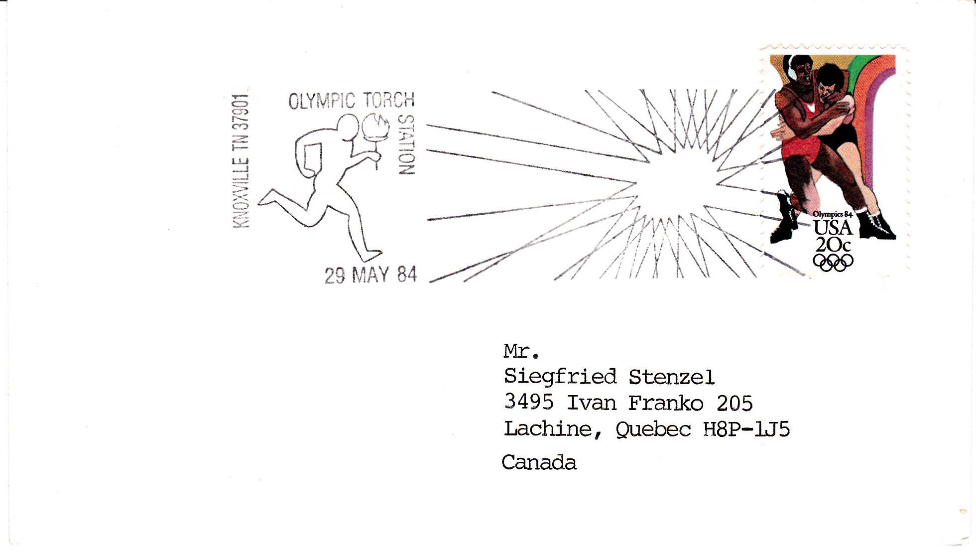 Am 29.5.1984 wurde die Stadt Knoxville (TN) vom Fackellauf erreicht, wie dieser Sonderstempel auf einem Brief nach Kanada zeigt.