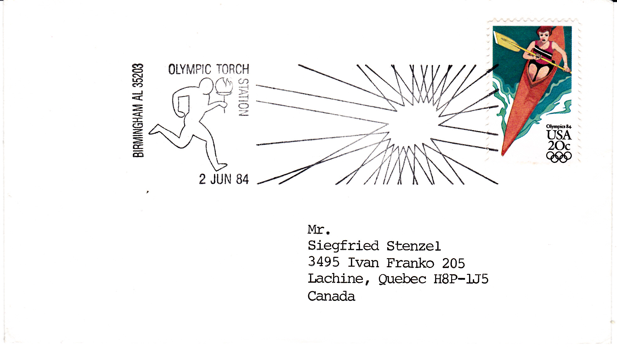 Auf diesem Brief nach Kanada zeigt uns der Sonderstempel aus Atlanta, dass der Fackellauf dort am 31.Mai1984 eintraf.