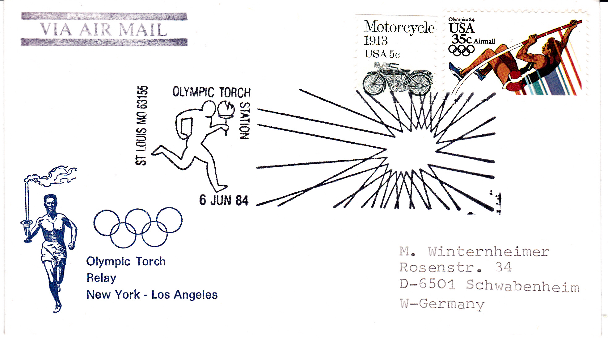 Am 6.6.1984 liefen die Fackelläufer durch die Stadt St. Louis, wie man an diesem Brief mit Luftpost nach Deutschland erkennen kann.