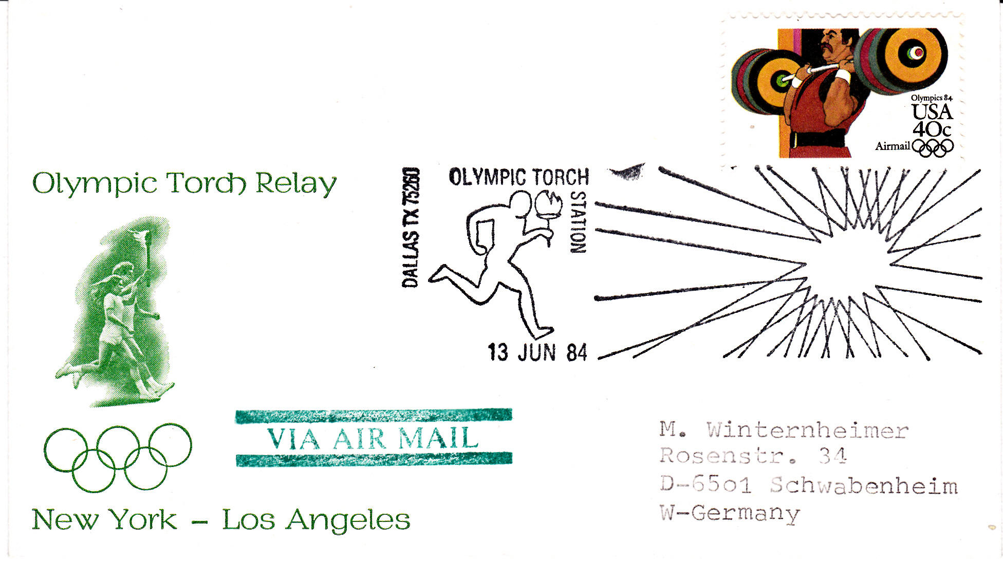 Am 13.6.1984 erreichte der Fackellauf auch die Stadt Dallas (Texas). Hier der Sonderstempel dazu auf einem Luftpostbrief nach Deutschland.