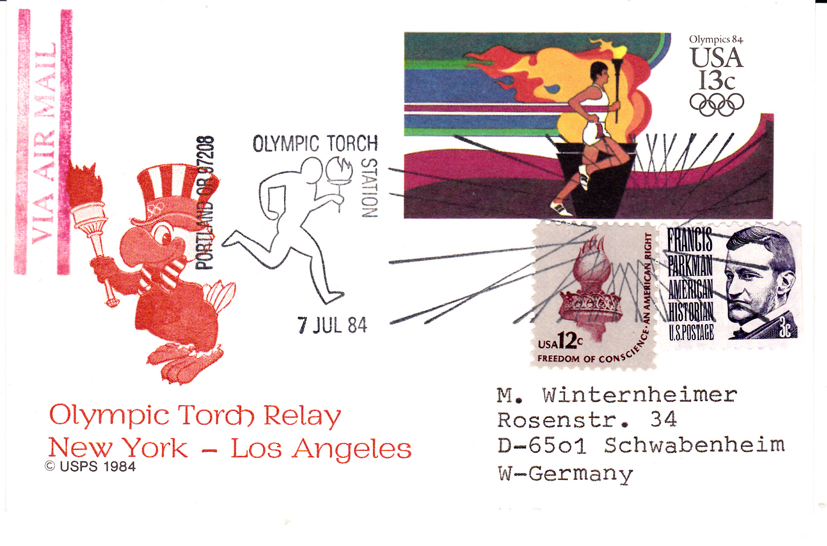 Am 7.7.1984 erreichte der Olympische Fackellauf die Stadt Portland im Bundestaat Oregon, was der Sonderstempel auf dieser Karte mit Luftpost nach Deutschland belegt.