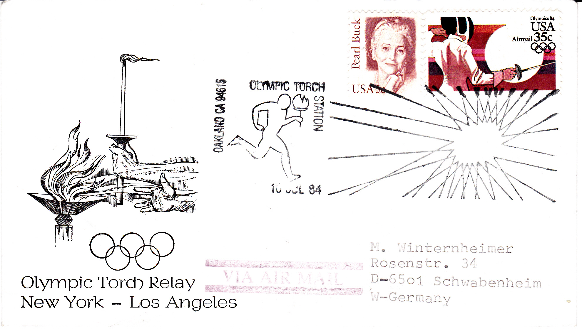 Der Sonderstempel auf diesem Brief mit Luftpost nach Deutschland belegt die Ankunft des Fackellaufes in Oakland am 10. Juli 1984.