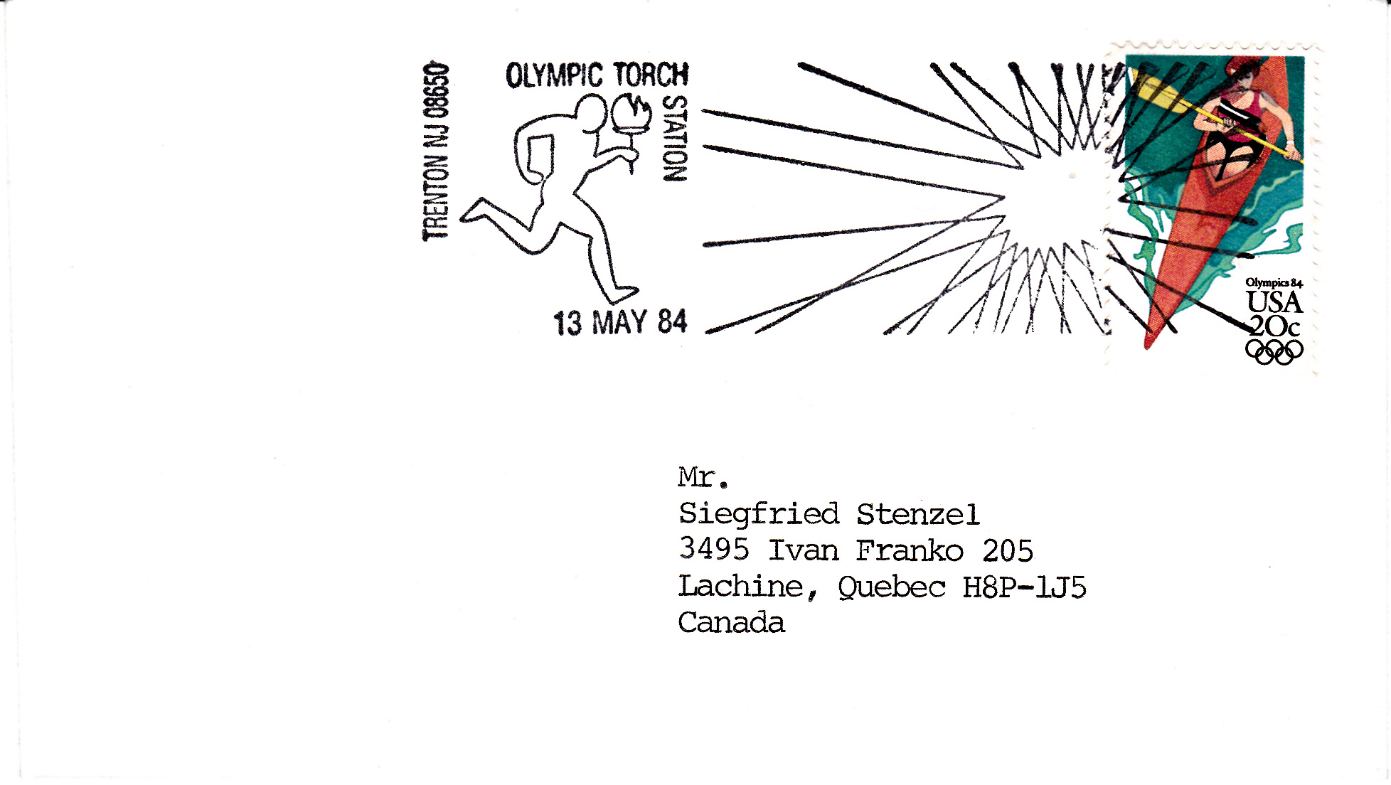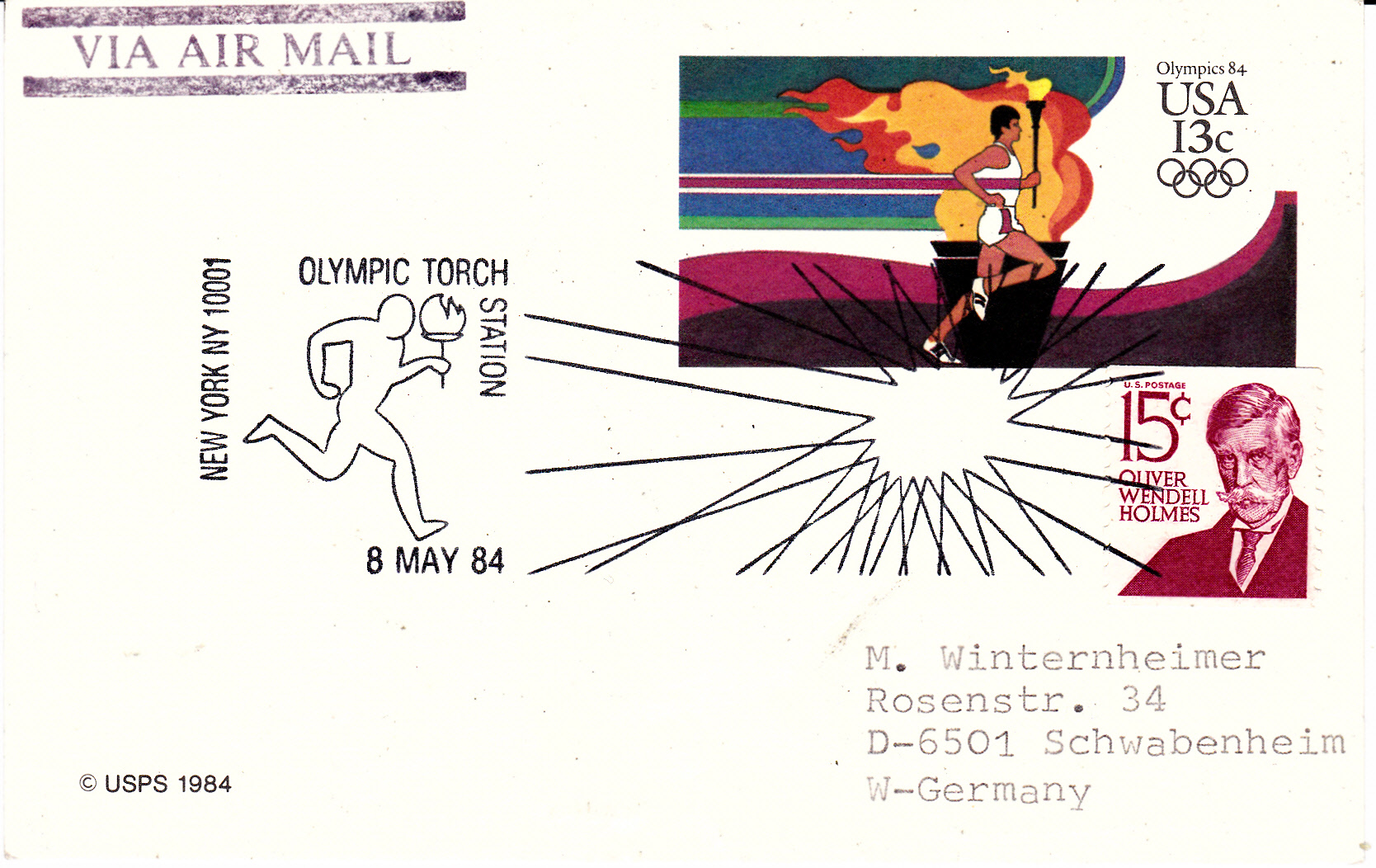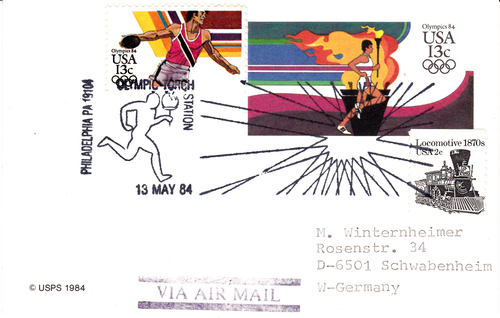 Am gleichen Tag passierte der Fackellauf auch Philadelphia, was dieser Sonderstempel vom 13.5.1984 auf einer Karte mit Luftpost nach Deutschland belegt.
