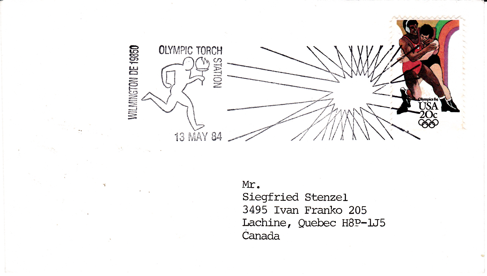 Am 13.5.1984 war auch noch die Stadt Wilmington (Delaware) Station des Fackellaufes, wie dieser Sonderstempel zeigt.