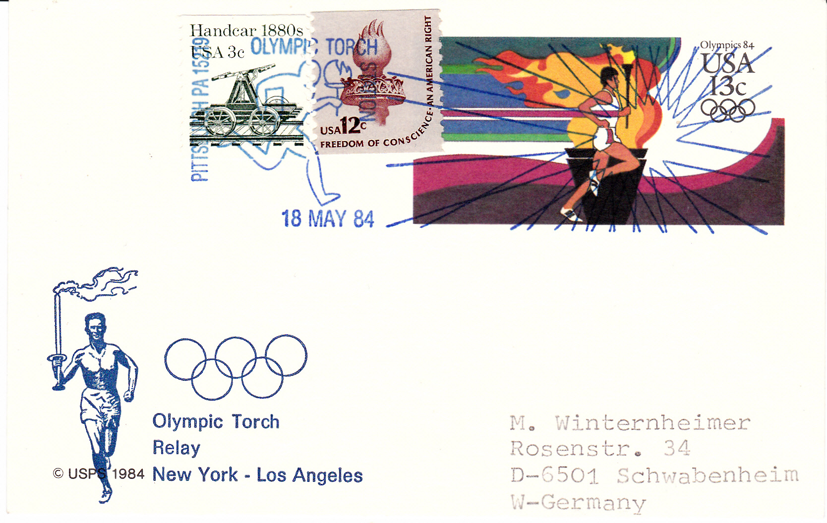Am 18.5.1984 machte der Fackellauf in Pittsburgh Station, wie dieser Stempel auf dieser Ganzsache nach Deutschland zeigt.