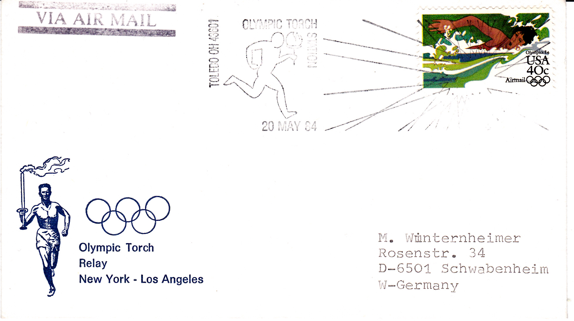 Am 20.5.1984 verlief der Fackellauf durch Toledo (Ohio) wie uns dieser Sonderstempel auf dem Luftpostbrief nach Deutschland zeigt.