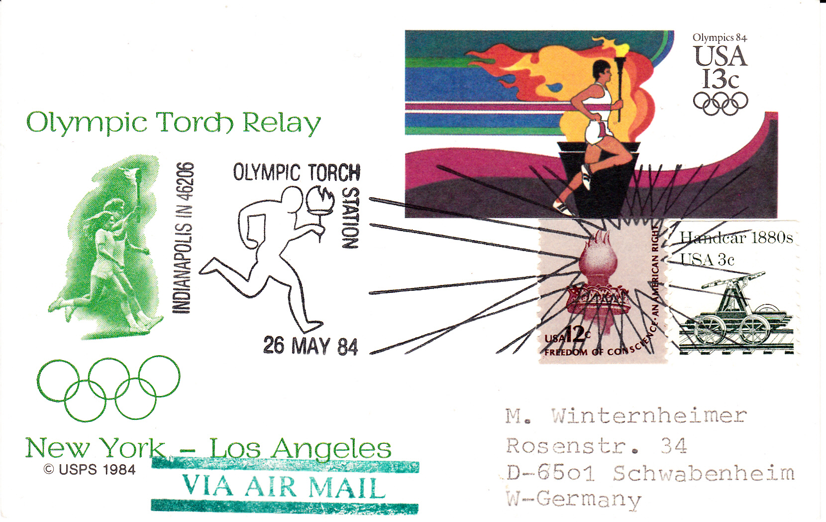 Dieser Sonderstempel vom 26.5.1984 auf einer Ganzsache mit Zusatzfrankatur mit Luftpost nach Deutschland belegt die Ankunft der Fackelläufer in Indianapolis.