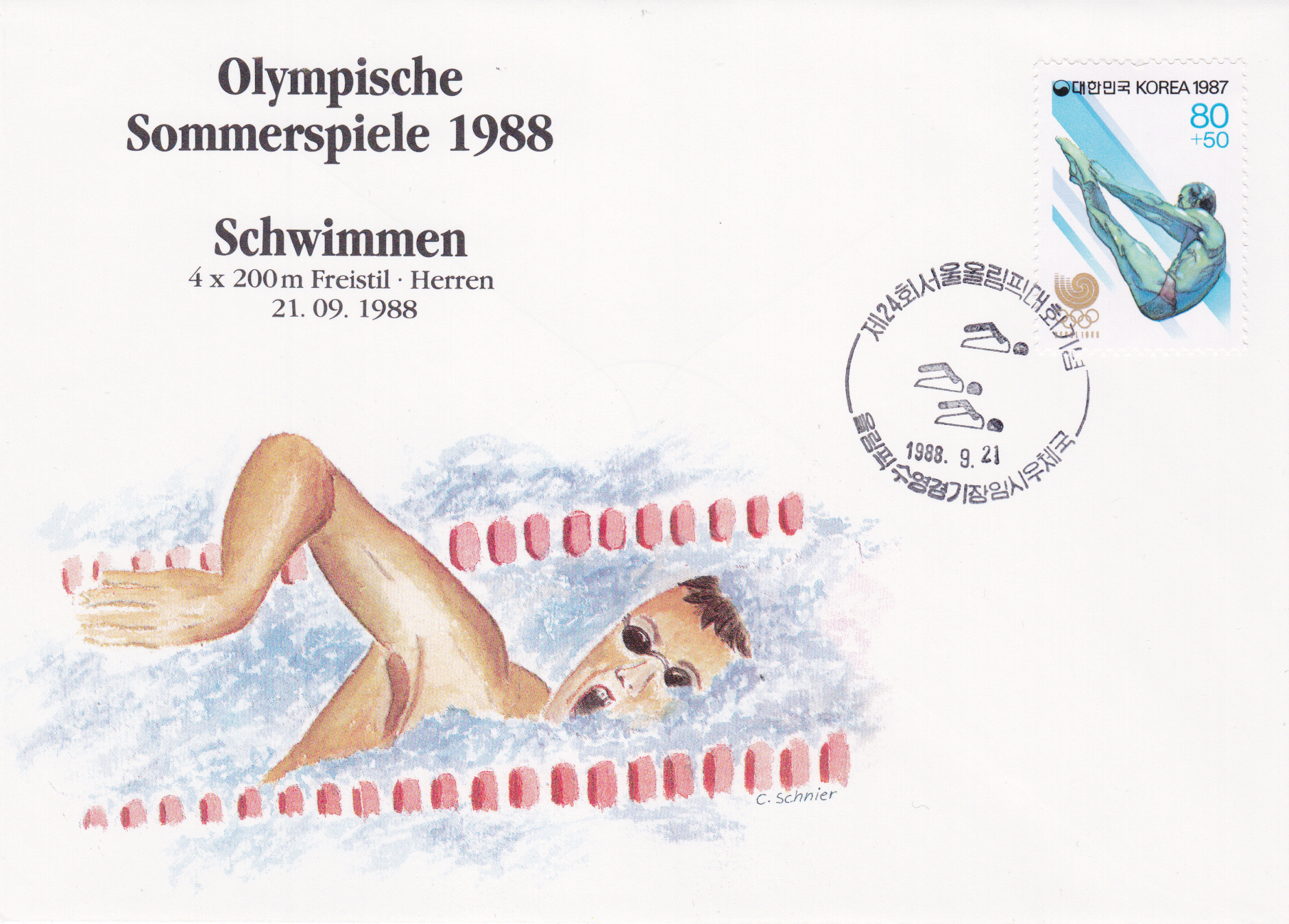 Ich beginne hier mal mit dem 20. September 1988. An diesem Tag fand das 1000m-Zeifahren auf der Bahn statt. Robert Lechner (geb. 22. Jan. 1967 in Bruckmühl) hat dabei eine Bronzemedaille erreicht. Mit dem Sonderstempel "Radfahren" kann dieser 3. Platz dokumentiert werden