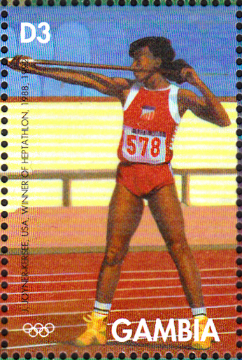 Die bereits in einem früheren Beitrag vorgestellte Olympiasiegerin Jacky Joyner-Kersee wird auch auf dieser Marke aus Gambia (MiNr 2405) zu den Spielen 1996 in Atlanta geehrt. Mit der Darstellung auf der Marke habe ich aber ein paar Probleme. Es sieht so aus, als ob sie kurz vor dem Anlauf einen Stab für Stabhochsprung in der Hand hält. Stabhochsprung ist aber keine Disziplin beim Siebenkampf der Frauen.