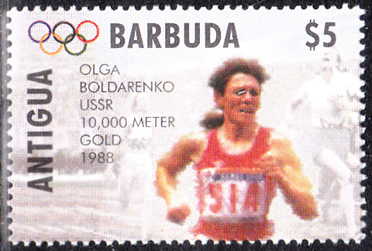 Auf dieser Marke (MiNr 2146) aus der gleichen in Antigua Barbuda erschienenen Serie zu den Olympischen Sommerspielen 1996 in Atlanta mit Goldmedaillengewinner früherer Spiele wird Olga Bondarenko gezeigt.