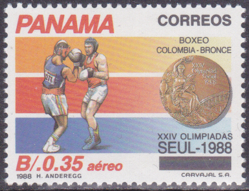 Mit dieser Marke aus Panama (MiNr 1687) wird ein kolumbianischer Boxer für eine Bronzemedaille geehrte, dies kann nur Jorge Eliécer Julio Rocha sein.