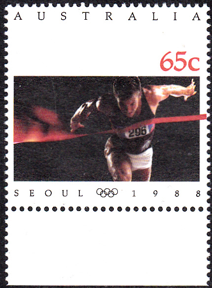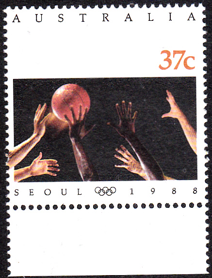Am 14.9.1988 sind in Australien Marken zu den Sommerspielen 1988 in Seoul erschienen. Hier die Marke zu 37 Cent (MiNr 1123) mit einer Darstellung zum Basketball.