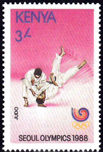 Eine Kampsszene beim Judo sehen wir auf diese Marke aus Kenia (MiNr 448).