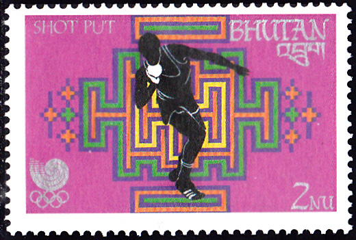 Auf dieser Marke aus Bhutan (MiNr 1080 A) ist ein Kugelstoßer abgebildet.